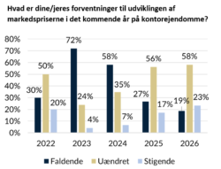 Generelt er der optimisme at spore inden for kontorejendomme og forventningerne til 2026 er de mest positive i de seneste fem år. Inden for kontorejendomme forventer 58% uændrede markedspriser, 23% forventer stigende markedspriser og 19% forventer faldende markedspriser.